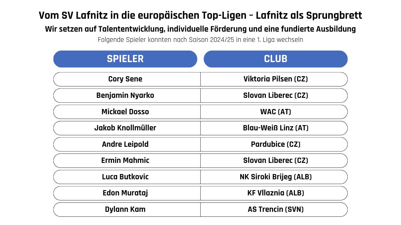Wir bieten Spielern eine klare Perspektive – vom Einstieg in die Akademie über den Sprung in die österreichische Bundesliga bis hin zu internationalen Möglichkeiten.Für diesen erfolgreichen Weg steht auch die enge Zusammenarbeit mit dem tschechischen Topklub Viktoria Pilsen ( Champions League Gruppenphase 2022/23, UEFA Europa League und Conference League), die talentierten Spielern zusätzliche Chancen eröffnet, sich auf internationalem Niveau zu beweisen. Unser Ziel ist es, Spieler gezielt zu fördern, damit sie langfristig auf höchstem Niveau bestehen können.